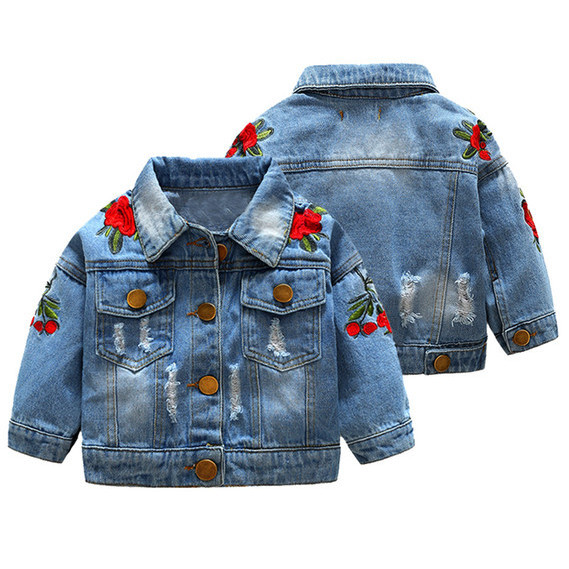 Джинсовий жакет для дівчинки. На плечах і рукавах прикрашені вишивками; потертості сквози. Застібається на металеві гудзики з об’ємними трояндами, на грудях кишені. Модель рукава з приспущеним плечем. Матеріал: джинс.