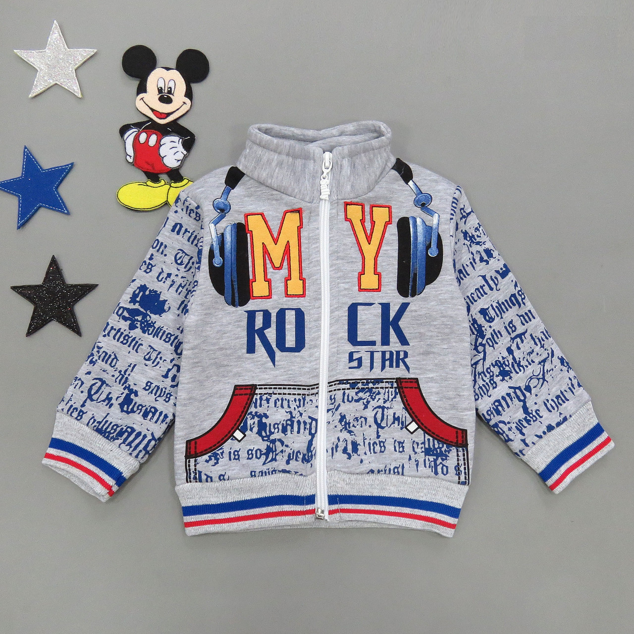 Тепла кофта для хлопчика. Тканина з начосом, середньої щільності; на кофті принт і букви-нашивки. Застібається на блискавку під горло. Склад: 95% бавовна, 5% еластан.